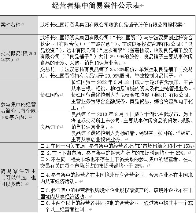 据国家市场监督管理总局官网披露,长江国贸收购良品铺子股权案已正式进入经营者集中反垄断审查阶段。尽管该行政审查程序与广州轻工的股权纠纷诉讼分属不同法律维度,但司法层面冻结宁波汉意所持19.89%股份的保全措施,已对交易架构产生实质性影响。